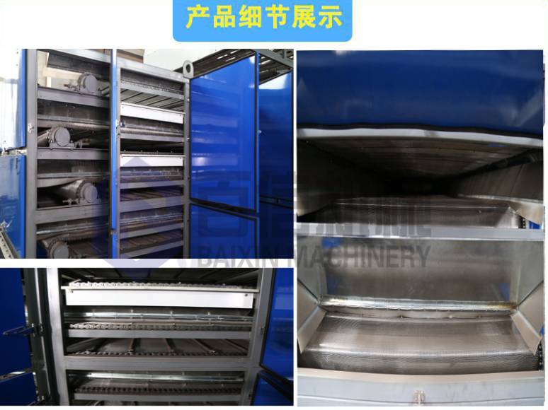 將需要干燥的青辣椒放置在輸送帶上,經(jīng)均料器后物料被平鋪在網(wǎng)帶上,輸送至烘干機(jī)內(nèi)部,在烘干機(jī)箱體內(nèi)呈“s"型逐層翻轉(zhuǎn)、下落,烘干后的青辣椒從出料口流出。經(jīng)過轉(zhuǎn)換后的熱風(fēng)從烘干機(jī)底部進(jìn)入,由于下部壓力大于上部壓力,熱氣流自下而上穿過每一層網(wǎng)帶和其上的物料層,逐層烘干,熱量交換均勻、充分,生產(chǎn)效率高,干燥品質(zhì)好。